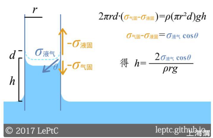 講到這里,我們已經有三種方法來解釋這個現(xiàn)象了:①水想增加自己跟玻璃管內壁的接觸面積,直到表面能的消耗不足以補償重力勢能;②固液接觸面的負張力把液體向上拉;③凹液面會降低液體內的壓強,從而外部氣壓把液體壓上來。三種方法都能推導出相同的結論,下圖中給出了第一種推法。