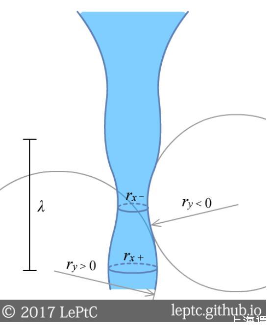 這一現(xiàn)象稱為普拉托-瑞利不穩(wěn)定性(Plateau–Rayleigh instability)。我們在柱狀界面上加一個波長為λ的擾動,橫截面上的曲率變化rx是促進柱的分裂的,但縱截面上ry的曲率變化會阻礙分裂,后者的效應隨λ變長而減弱。