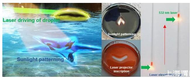 研究中,王志明團隊也展示了一些基本應(yīng)用示例,比如借助激光和日光可以在液體表面雕刻圖形,還可讓激光搬運液體,讓激光驅(qū)動毛細(xì)管中的液體,讓激光驅(qū)動液體表面液滴、甚至驅(qū)動不同液滴發(fā)生化學(xué)反應(yīng)的應(yīng)用。