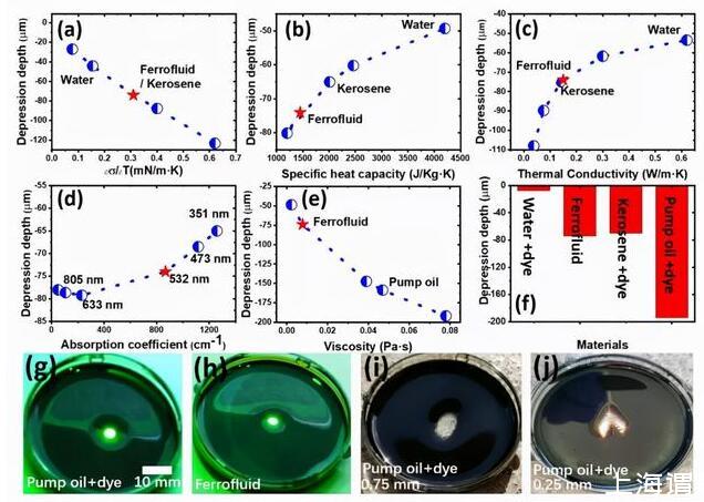 他們發(fā)現(xiàn),液體的厚度、表面張力的溫度系數(shù)、熱導(dǎo)、比熱容、吸光性和粘度等物理參數(shù),都會對光致液體形變產(chǎn)生重要影響,尤其是吸光系數(shù)和液體的表面張力溫度系數(shù)。