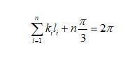 假設(shè)二維干泡沫中的任一氣泡如圖3b所示,氣泡的邊數(shù)為n,從a點開始,再回到a的邊長分別標(biāo)記為l1到ln,每邊所對應(yīng)的曲率為k1到kn(Plateau第一定律)。現(xiàn)在假設(shè)有一點從a點沿著邊向b運動,到b點時,所走的路徑為l1,轉(zhuǎn)動的角度為這條邊所對應(yīng)的圓心角(向外為正,向內(nèi)為負(fù)值),為k1*l1。此時要想繼續(xù)沿著邊運動,需要向內(nèi)轉(zhuǎn)動π/3角度(根據(jù)Plateau第二定律),如圖3b所示。轉(zhuǎn)動后繼續(xù)運動,直到到達(dá)原來的點a。此過程,n條邊總共在頂點處轉(zhuǎn)動的角度為nπ/3,在邊上轉(zhuǎn)動的角度為