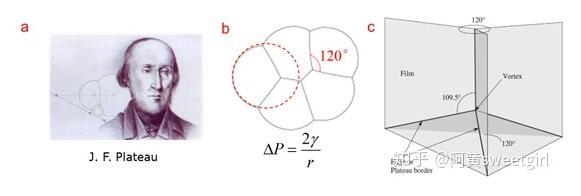 泡沫物理學(xué)集中于研究泡沫的結(jié)構(gòu)、靜力學(xué)、動態(tài)演變及排液等內(nèi)容。它是一個十分古老的學(xué)科,由比利時物理學(xué)家Plateau在19世紀(jì)中葉開創(chuàng)(圖2a)。Plateau在數(shù)十年的失明的時光里,依舊通過指導(dǎo)他侄子做試驗,堅持研究肥皂泡薄膜的幾何形態(tài)及其背后隱藏的力學(xué)規(guī)律。1873年,他和侄子把自己的實驗現(xiàn)象和分析結(jié)果做了系統(tǒng)整理,以法文發(fā)表,從此把對泡沫結(jié)構(gòu)的研究由定性印象推到了量化階段,開創(chuàng)了泡沫物理學(xué)(Ref 2)。在泡沫靜力學(xué)方面,Plateau的主要貢獻(xiàn)在于其提出了干泡沫的靜態(tài)結(jié)構(gòu)力學(xué)的三定律,它是后續(xù)泡沫研究的基石: