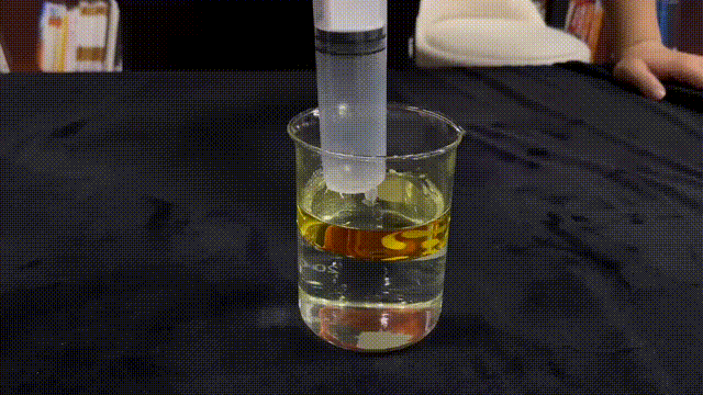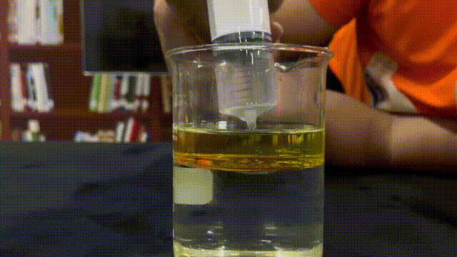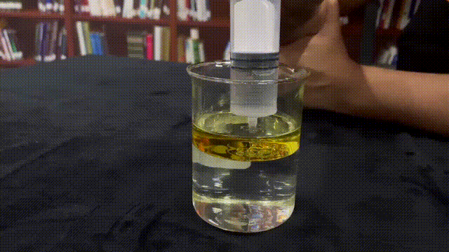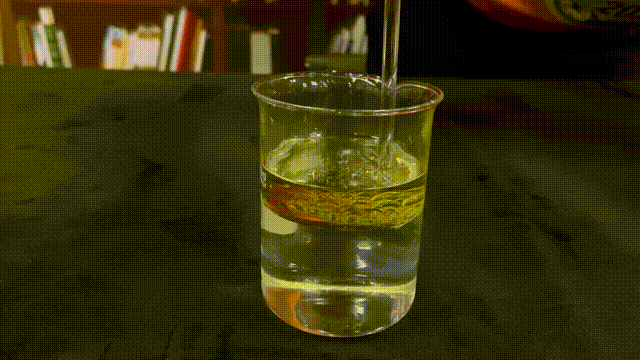 首先,我們沿杯壁向盛有水的燒杯中加入食用油,使水油有一個(gè)干凈的界面