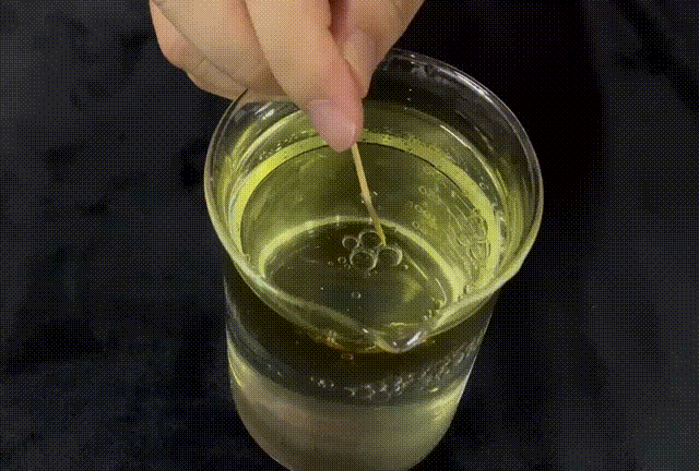 不過(guò)如果我們用牙簽去破壞這個(gè)界面,小水球就會(huì)“合成”大水球,或者如果去破壞水球與下方水面之間的油膜的話,水球就會(huì)破裂、流入燒杯底部。