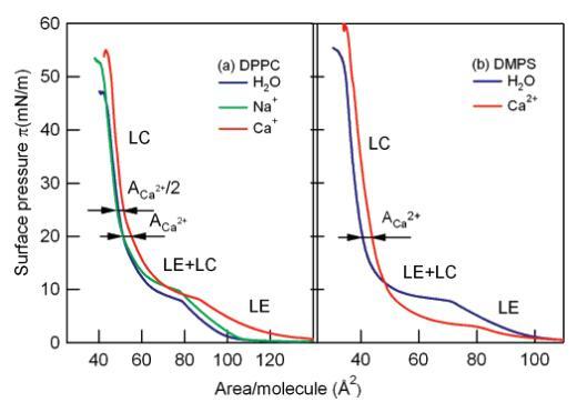 對(duì)于1 M Ca2+溶液上的DMPS單分子膜,與觀察到的純水共存區(qū)的π)10 mN/M壓力相比,LE+LC平臺(tái)壓力降低到π)5 mN/M;在較高的表面壓力(π>20 mN/m)下,兩條等溫線的位移保持等于Ca2+足跡,4?2/脂,未觀察到明顯轉(zhuǎn)變?yōu)?:1脂/Ca2+復(fù)合物。