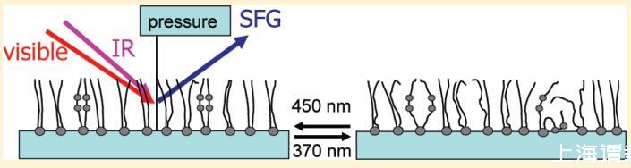 在此,我們研究了光開關(guān)脂質(zhì)DT Azo-5P(圖1)的單分子膜,該單分子膜是純的,并與脂質(zhì)1,2-二棕櫚酰-sn-甘油-3-磷酸膽堿(DPPC)混合。如圖1中的紫外/可見光譜所示,光活性脂質(zhì)可分別在370 nm和450 nm的光照下從其反式狀態(tài)切換到順式狀態(tài)并返回。我們將表面壓力測(cè)量與無標(biāo)簽、寬帶振動(dòng)和頻產(chǎn)生(VSFG)光譜相結(jié)合。這些技術(shù)使我們能夠研究空氣-水界面上的脂質(zhì)分子單層??梢垣@得有關(guān)脂類與水分子相互作用的信息以及脂類的分子結(jié)構(gòu)。在非線性光學(xué)技術(shù)VSFG中,紅外(IR)光束和可見光(VIS)光束在界面處組合,產(chǎn)生具有兩個(gè)入射光束和頻率的信號(hào)。如果紅外與分子振動(dòng)共振,信號(hào)就會(huì)強(qiáng)烈增強(qiáng)。研究表明,這種通過分子振動(dòng)的技術(shù)可以提供有關(guān)脂類分子構(gòu)象和取向的信息。11-18和頻產(chǎn)生在中心對(duì)稱介質(zhì)中是被禁止的,因?yàn)樗且粋€(gè)二階非線性光學(xué)過程。19因此,該技術(shù)對(duì)中心對(duì)稱材料(例如水表面)的最外表面分子層敏感。相反,缺少信號(hào)表明界面上的材料或分子基團(tuán)是中心對(duì)稱的。對(duì)于金表面偶氮苯功能化的自組裝單分子膜,SFG在確定光異構(gòu)化的截面和機(jī)理方面非常有用。得出的結(jié)論是,光異構(gòu)化是由直接電子激發(fā)驅(qū)動(dòng)的,類似于液相中的偶氮苯。3我們將表明,通過切換光脂,可以可逆地控制脂質(zhì)的表面壓力和分子順序。在同時(shí)含有光脂和脂質(zhì)DPPC的混合單分子膜中,我們可以通過光學(xué)切換偶氮苯基脂質(zhì)來控制DPPC的順序。這為體外控制脂質(zhì)-脂質(zhì)相互作用提供了一種新的手段。