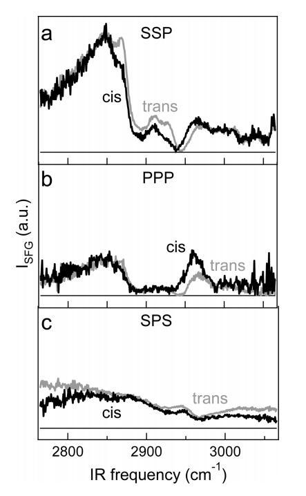 圖5:。(a)在P的反式和順式狀態(tài)下,DT-Azo-5P的純單層在65?2處的歸一化VSFG光譜與SSP極化分別為6和20 mN/m。(b)與a部分類(lèi)似,但PPP極化。(c)反、順態(tài)SPS極化中的SFG譜(~每分子78?2),壓力為2和15 mN/m。三個(gè)面板具有相同的垂直刻度。