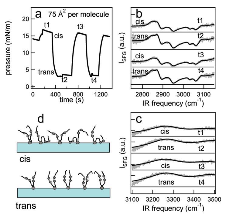 圖4:(a)在每分子75?2的面積處,脂質(zhì)/H2O界面處的光開(kāi)關(guān)脂質(zhì)的表面壓力作為時(shí)間的函數(shù)。370和450 nm光照射~100秒分別產(chǎn)生cis(高壓)和trans(低壓)狀態(tài)。壓力的微小劇烈波動(dòng)是由于樣品高度的變化,以校正水的蒸發(fā)。(b和c)CH和OH區(qū)域(灰色)中相應(yīng)的VSFG光譜,以及洛倫茲線形狀模型的擬合(見(jiàn)正文)。為了清晰起見(jiàn),對(duì)光譜進(jìn)行了偏移。t1至t4對(duì)應(yīng)于面板a中進(jìn)行光譜測(cè)量的時(shí)間。(d)脂質(zhì)尾部方向示意圖。光開(kāi)關(guān)脂質(zhì)的偶氮苯部分用灰色圓圈表示。