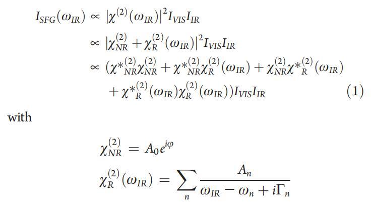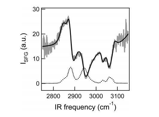 圖3:。在密度為75?2/分子和壓力為~3 mN/m。共振信號(hào)疊加在大型非共振背景上,由于共振信號(hào)和非共振信號(hào)之間的干擾,導(dǎo)致色散線型。黑色虛線表示NR振幅設(shè)置為零時(shí)的DT Azo-5P信號(hào)。