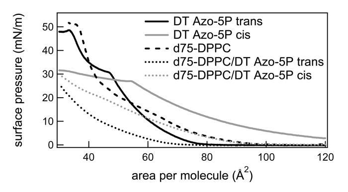 圖2:反式和順式狀態(tài)下的光開(kāi)關(guān)脂質(zhì)DT Azo-5P的表面壓力與面積等溫線(實(shí)線),d75-DPPC的表面壓力與面積等溫線(虛線),以及光開(kāi)關(guān)兩種狀態(tài)下的1:5摩爾比的光開(kāi)關(guān)脂質(zhì)與d75 DPPC的表面壓力與面積等溫線(虛線)。