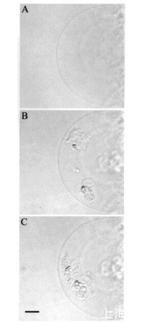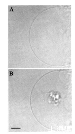 圖9:HMC圖像序列,說(shuō)明了在添加肽之前(圖a)和應(yīng)用肽后立即通過(guò)temporin L.巨大囊泡轉(zhuǎn)化SOPC/膽固醇(Xchol)0.10)巨大脂質(zhì)體≈0.24 fmol的temporin L(面板B)。面板B中比例尺的長(zhǎng)度對(duì)應(yīng)于50μm。