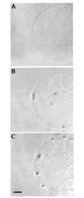 時(shí)間蛋白對(duì)膜拓?fù)浣Y(jié)構(gòu)的影響。巨大脂質(zhì)體是生物膜的優(yōu)秀模型,因?yàn)槠涑叽缗c細(xì)胞相當(dāng)。此外,它們可以通過(guò)光學(xué)顯微鏡進(jìn)行觀察(15,21)。我們之前對(duì)馬加寧2和吲哚肽的研究表明,這些肽對(duì)巨大脂質(zhì)體膜的拓?fù)浣Y(jié)構(gòu)有顯著影響(15)。在本研究中,在類似條件下,通過(guò)顯微鏡觀察了在巨大囊泡外表面添加這些肽后,temporins對(duì)巨大脂質(zhì)體三維拓?fù)浣Y(jié)構(gòu)的影響。SOPC巨脂質(zhì)體即使暴露于大量該肽(約1.2 fmol的temporin B)(每個(gè)重復(fù)100份12 amol)時(shí),也不受temporin B的影響。同樣,含有膽固醇(Xchol)0.10)的巨大囊泡也不受該量的顳葉素B的影響。然而,在將該肽添加到SOPC和SOPC/膽固醇(Xchol)0.10)巨大脂質(zhì)體的表面時(shí),偶爾會(huì)觀察到相鄰囊泡之間的粘附(數(shù)據(jù)未顯示)。然而,在POPG(XPOPG)0.10的存在下,已經(jīng)≈36 amol(10-18 M)的顳葉素B(約60 fL,3次注射)施加在巨大囊泡表面上,引起巨大囊泡膜拓?fù)浣Y(jié)構(gòu)的顯著變化(圖6,面板B)。具體來(lái)說(shuō),小顆粒(φ≈10μm),然后進(jìn)入巨大脂質(zhì)體的內(nèi)腔(圖6,面板B)。進(jìn)一步增加≈0.24 fmol的顳蛋白B(約400 fL,20次注射)導(dǎo)致巨大囊泡內(nèi)這些顆粒的數(shù)量增加(圖6,面板C)。還觀察到巨大囊泡表面的顆粒聚集(圖6,面板C)。隨后,在≈10分鐘后,將顆粒轉(zhuǎn)移到巨大脂質(zhì)體的內(nèi)腔中。