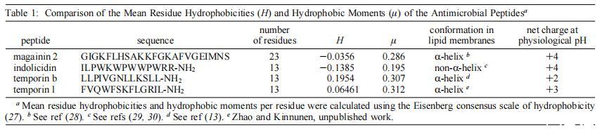 我們的長(zhǎng)期目標(biāo)是建立最低的序列要求,這可以進(jìn)一步作為設(shè)計(jì)新型抗菌肽類似物的指導(dǎo)原則。我們之前已經(jīng)比較了兩種抗菌肽,馬蓋寧2和吲哚肽對(duì)本研究中使用的相同模型膜系統(tǒng)的影響,即。,單層、脂質(zhì)體和巨大囊泡(15)。我們?cè)缙谘芯恐惺褂玫碾氖沁x擇的,因?yàn)樗鼈兇韮煞N不同類型的抗菌肽家族。在本研究中,我們使用了兩種13個(gè)氨基酸的肽,即與吲哚肽長(zhǎng)度相似的肽。肽的結(jié)構(gòu)參數(shù)不同,如電荷、構(gòu)象、疏水性、疏水力矩和大?。ū?)。有趣的是,在所研究的四種肽中,以摩爾為基礎(chǔ)計(jì)算的時(shí)間蛋白L最有效,作用于中性和酸性磷脂膜。與其他三種肽相比,其凈陽(yáng)離子電荷和疏水性具有平均值(表1)。然而,在所示的肽中,temporin L具有最高的平均疏水力矩,這表明這可能是與其有效的膜擾動(dòng)作用相關(guān)的一個(gè)重要參數(shù),這與之前比較magainin 2和其他抗菌肽的研究一致(31)。