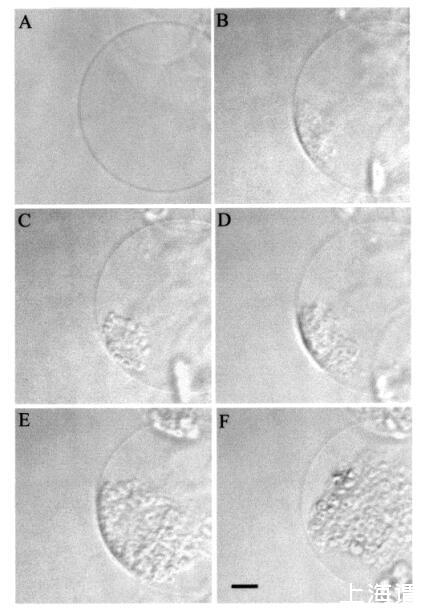 然后我們研究了顳葉素L對(duì)巨大脂質(zhì)體的影響。圖7所示的圖像序列說(shuō)明了由于temporin L引起的SOPC巨大脂質(zhì)體的轉(zhuǎn)化。有趣的是,大約12 amol temporin L(1次注射)已經(jīng)影響了SOPC膜的外觀,在添加肽后1秒內(nèi),巨大囊泡內(nèi)出現(xiàn)聚集結(jié)構(gòu)(圖7,面板B)。此外,相鄰的巨大囊泡也受到類似囊泡形成的影響(圖7,面板B,研究的巨大脂質(zhì)體下方)。進(jìn)一步添加temporin L(最多≈0.12 fmol,共10次重復(fù)注射)不會(huì)誘導(dǎo)進(jìn)一步的囊泡形成,而兩個(gè)“內(nèi)吞”聚集體粘附在肽微注射部位的巨大脂質(zhì)體表面。大約5分鐘后,這兩個(gè)“內(nèi)吞”聚集體粘附在一起,在巨大囊泡內(nèi)形成一個(gè)更大的聚集體結(jié)構(gòu)(圖7,面板C)。與顳葉素L對(duì)SOPC巨脂質(zhì)體的作用類似,該肽在POPG(XPOPG)0.10存在下誘導(dǎo)類內(nèi)吞過(guò)程,圖8)。更具體地說(shuō),在添加約12 amol的temporin L(1次注射)后,暴露于肽的巨大脂質(zhì)體表面的區(qū)域變暗,顯示折射率的顯著變化,并指示形成緊密堆積的三維結(jié)構(gòu),僅部分保留在焦平面中(圖8,面板B)。在內(nèi)部≈1秒后,巨大脂質(zhì)體內(nèi)出現(xiàn)了小顆粒聚集體和暗區(qū)(圖8,面板C)。同時(shí),還觀察到相鄰巨大囊泡中的囊泡形成(圖8,圖B和圖C)。隨后總共增加了≈24阿米爾的顳葉素L(2次注射)使另一組“內(nèi)吞”小顆粒出現(xiàn)在巨大脂質(zhì)體內(nèi),與先前形成的聚集體粘附(圖8,面板D)。之后≈1分鐘,其中一些顆粒(φ≈8μm)從巨大脂質(zhì)體內(nèi)的雙層釋放(數(shù)據(jù)未顯示)。有趣的是,在進(jìn)一步添加約12 amol的Temporain L(總共3次注射)后,分離的小顆粒再次聚集,暗區(qū)的面積增加(圖8,面板E)。暗區(qū)面積的增加通過(guò)添加另一個(gè)≈24 amol temporin L(共5次注射)。幾分鐘后,聚集的“內(nèi)吞”小顆粒進(jìn)入巨大囊泡的內(nèi)腔,而膜表面的暗區(qū)消失(圖8,面板F)。同時(shí)觀察到相鄰的巨大脂質(zhì)體的囊泡形成。有趣的是,在膽固醇(Xchol)為0.10的情況下,需要更多的時(shí)間蛋白L來(lái)誘導(dǎo)囊泡形成(圖9)。然而,在添加約0.24 fmol(20次注射)的Tempolin L后,小顆粒的“內(nèi)吞”聚集物以及≈巨大脂質(zhì)體內(nèi)出現(xiàn)直徑為9μm的顆粒(圖9,面板B)。隨后添加≈0.24 fmol的肽(共40次注射)在巨大囊泡內(nèi)誘導(dǎo)另一組小顆粒,約30秒后與第一個(gè)聚集物合并(數(shù)據(jù)未顯示)。然而,隨后進(jìn)一步添加temporin L(高達(dá)約1.2 fmol,100次注射)對(duì)巨大脂質(zhì)體膜沒(méi)有進(jìn)一步的可見(jiàn)變化。