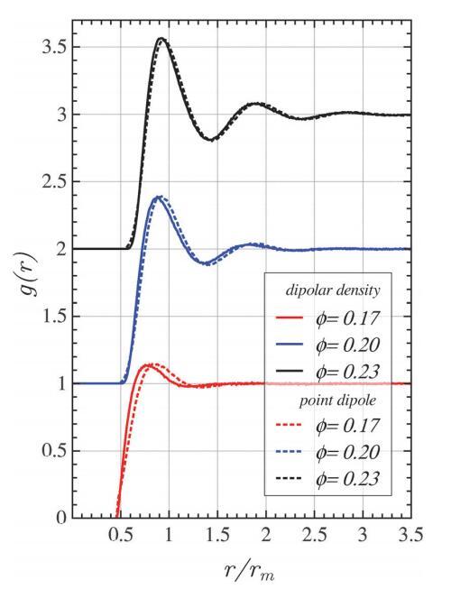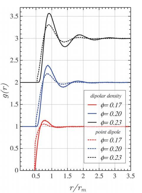 在第一個(gè)峰值位置和g(r)開始偏離零的小區(qū)域觀察到輕微差異。當(dāng)系統(tǒng)更加結(jié)構(gòu)化時(shí),協(xié)議會(huì)得到改善。特別是,對于弱相互作用域,差異開始明顯。這些偏差是由于點(diǎn)偶極力在接觸時(shí)趨于有限值,而在偶極密度情況下,它會(huì)發(fā)散。因此,硬盤相互作用與點(diǎn)偶極子模型有關(guān)。
