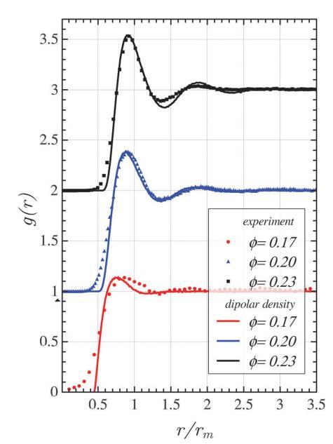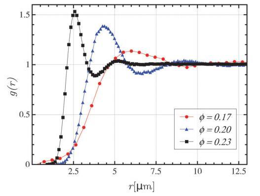 圖5顯示了三個(gè)實(shí)驗(yàn)系統(tǒng)的徑向分布函數(shù)。在所有情況下,g(r)類似于液體,顯示出明確的第一峰(在rmax處),其表征了第一配位殼層,即最近鄰。此外,對于f=0.20和f=0.23的系統(tǒng),觀察到與第二配位殼對應(yīng)的標(biāo)記的第一最小值和第二最大值。由于“強(qiáng)”排斥作用,最近鄰距離遠(yuǎn)大于平均磁疇直徑。因此,硬核斥力不是結(jié)構(gòu)的決定因素,系統(tǒng)的特征長度是平均幾何距離rm=r 1/2。