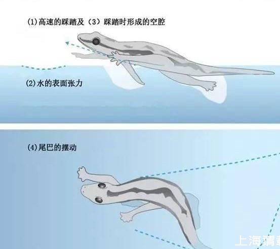 這種壁虎有大約6克重,相比于水黽來說它確實(shí)重多了,這似乎不具備利用水表面張力的能力。但壁虎有辦法,它有一身超級防水的皮膚和帶蹼的腳掌,通過四條腿大力拍擊水面,壁虎在它身體下方制造一個空氣的空腔,這時候水的表面張力會因?yàn)橛谢謴?fù)曲率最小化的趨勢,從而將壁虎的身體向上方推。與此同時,壁虎扭動他的身體和尾巴,尾巴像一支船櫓一樣驅(qū)動壁虎以1米/秒的速度在水面飛奔。