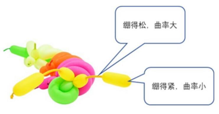 很顯然,一個(gè)決定因素就是張力的大小:皮膜繃的越緊,所能產(chǎn)生的壓力差就越大。但是還有另一個(gè)很重要的因素,就是表面彎曲的程度,也就是它的曲率。我們還是用氣球做一個(gè)說(shuō)明,例如下面這個(gè)氣球: