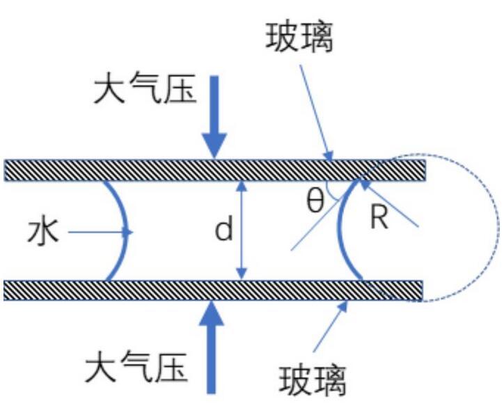 我們可以想象,當(dāng)兩片玻璃間隙非常小的時(shí)候,這個(gè)凹液面的曲率就會(huì)非常大,在這個(gè)時(shí)候,液體壓力與大氣壓的差就會(huì)很大,因此把玻璃擠壓在一起的力也就很大。我們可以用楊-拉普拉斯公式來(lái)估算一下。
