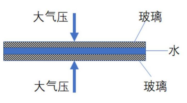 也就是說(shuō),由于帕斯卡原理,縫隙中的水也會(huì)將大氣壓傳遞到兩片玻璃的縫隙內(nèi)部。大氣壓的作用效果并非是「向內(nèi)」擠壓兩片玻璃,因?yàn)樵诳p隙內(nèi)部同樣存在著壓力。