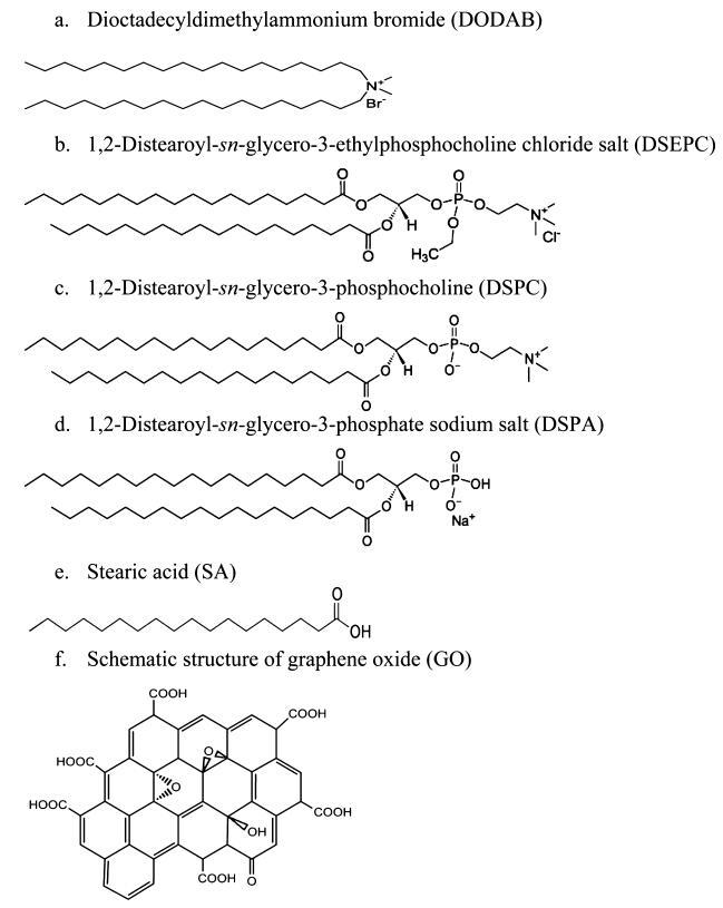 正電荷脂質(zhì)二十八烷基二甲基溴化銨(DODAB)和1,2-二硬脂酰-sn-甘油-3-乙基磷酸膽堿氯化鹽(DSEPC)、中性電荷兩性脂質(zhì)1,2-二硬脂酰-sn-甘油-3-磷酸膽堿(DSPC)和負電荷脂質(zhì)1,2-二硬脂酰-sn-甘油-3-磷酸鈉鹽(DSPA)購自Avanti Polar Lipides(Alabaster,AL)。硬脂酸(SA)購自SigmaAldrich(密蘇里州圣路易斯)。由于頭部基團中存在陰離子磷酸鹽和陽離子季銨中心,DSPC帶中性電荷,如方案1c所示。由于羧基脫質(zhì)子化,SA被認為是帶負電的分子。所有這些脂質(zhì)在非極性尾部都有18個碳鏈烷基。光譜級氯仿和甲醇來自MP Biomedicals(Solon,OH)。單層GO購自ACS Material LLC(馬薩諸塞州梅德福德)。所有這些化學(xué)品均未經(jīng)任何進一步凈化?;瘜W(xué)結(jié)構(gòu)如圖1所示。實驗中使用的去離子水來自Modulab 2020水凈化系統(tǒng)(德克薩斯州圣安東尼奧)。去離子水的電阻率、表面張力和pH值在20.0±0.5°C時分別為18 MΩ·cm、72.6 mN/M和5.6。所有實驗均在恒溫20.0±0.5°C、濕度50±1%的潔凈室(1000級)中進行。