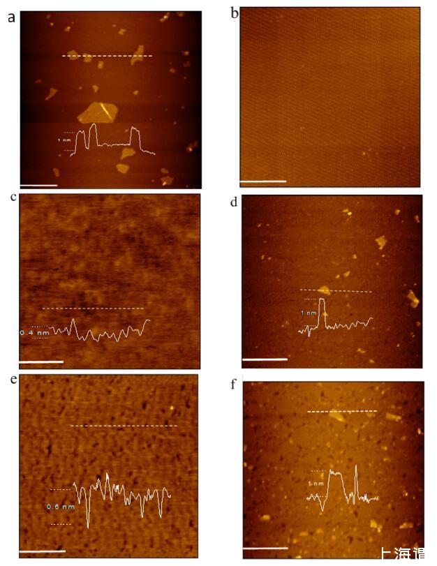 圖5.新切割云母表面上的AFM圖像(比例尺=1μm):(a)干燥后的一滴GO分散液;(b)LB膜在空氣中不沉積脂質(zhì)的對照實(shí)驗(yàn)?GO-水界面;(c)從空氣中轉(zhuǎn)移的DODAB LB膜?純水界面;(d)從空氣中轉(zhuǎn)移的DODAB LB膜?GO-水界面;(e)從空氣中轉(zhuǎn)移的DSEPC的LB膜?純水界面;(f)從空氣中轉(zhuǎn)移的DSEPC的LB膜?轉(zhuǎn)到水界面。所有脂質(zhì)LB膜在20 mN/m的恒定表面壓力下轉(zhuǎn)移。