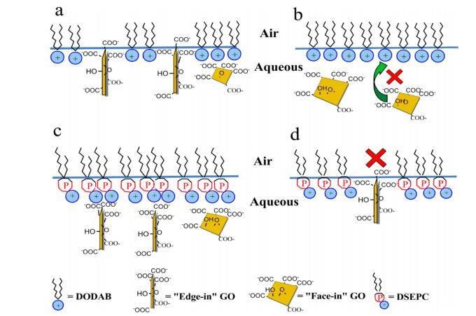 圖3.GO在空氣中并入DODAB(a,b)和DSEPC(c,d)單層時(shí)可能的方向示意圖?水界面。