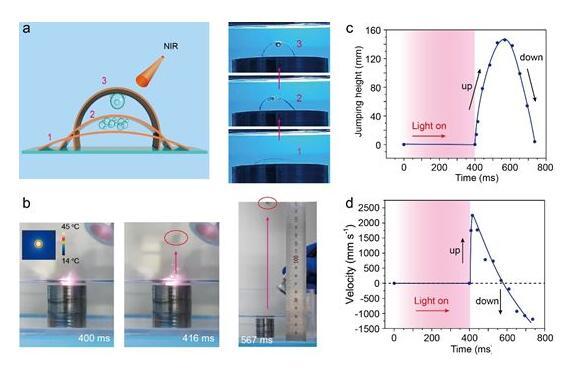 光刺激下驅(qū)動器可以在極短的響應(yīng)時(shí)間(400 ms)內(nèi)從液體介質(zhì)跳越到空氣中,最高速度為2 m/s,高度可達(dá)14.3 cm。