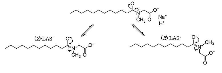 Bordes等人研究了氫鍵對甘氨酸鹽和肌氨酸鹽自組裝的影響[17]。Gad等人研究了具有不同碳鏈長度的N-?;“彼猁}的界面張力[3]。還對含有SLA的二元混合物與Gemini表面活性劑[18]和陽離子聚合物[19]進(jìn)行了一些界面研究。然而,這些研究沒有考慮它們的pH影響。Tsubone等人在pH值為10.5[20]時(shí)對SLA進(jìn)行了界面張力測量。然而,SLAS水溶液的界面張力在很大程度上取決于pH,在膠束前和膠束后區(qū)域中,當(dāng)pH小于約7時(shí),其值顯著下降。cmc和C20在較低pH下也會(huì)降低,但cmc/C20比在pH<7.3時(shí)增加。該比值的增加通常意味著親水頭的尺寸增加和/或與反陽離子的締合增加。在pH<7.3時(shí),Γmax也急劇增加。這些結(jié)果清楚地表明,在空氣-水界面的較低pH區(qū)域,SLA的Na+陽離子被H+取代。向溶液中加入Tl+,證實(shí)LAS的界面張力?并且它們以H+<Na+的順序增加,這與這些結(jié)果一致。此外,我們使用1H-NMR和13CNMR研究了D2O和CD3OD中HLA和SLA的結(jié)構(gòu)差異。根據(jù)這些結(jié)果,例如,來自LAS親水部分中1小時(shí)的所有信號?可以想象,HLA和SLA都具有共振結(jié)構(gòu),(Z)-LAS?和(E)-LAS?,如圖9所示。通過NMR[21,22]的膠束化也報(bào)告了這些SLAS異構(gòu)體的存在。根據(jù)分裂峰的積分比,Z/E形式的豐度比確定為SLA為1:1,HLA為2:1。由于E型比Z型體積大,這可能是Γmax隨pH值增加而減小的第二個(gè)原因,直到pH值為7.3。另一方面,除了RB的各向異性(在pH<7時(shí)明顯增加)外,含水體中的膠束性質(zhì)對pH的依賴性小于界面性質(zhì)。然而,在pH值降低時(shí),聚集數(shù)和流體動(dòng)力學(xué)半徑的小幅度增加趨勢以及膠束核的微極性的減小趨勢可以很好地解釋為LAS親水性頭基團(tuán)之間的靜電力減小?由Na+到H+的反陽離子置換引起,與界面性質(zhì)的情況相同。雖然我們尚未確定界面和膠束中HLA的pKa值,但這些值應(yīng)大于水溶液中的pKa值(pKa,bulk=3.3);界面處的值可能略大于膠束中的值。pH<7時(shí)體積較小的Z型的增加也與膠束性質(zhì)相容,并可能與膠束親水部分附近RB各向異性的增加直接相關(guān)。