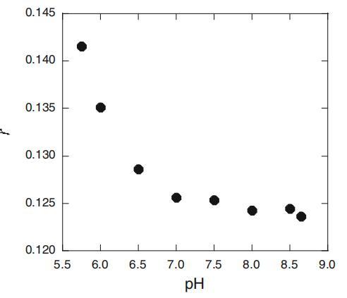 圖8:若丹明B在SLAS膠束(r)處的熒光各向異性與CS=25mM時(shí)pH的關(guān)系圖