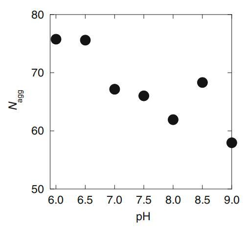 為了評估膠束(Nagg)的聚集數(shù),我們使用帶有猝滅劑(HPYL)的探針(Py)的穩(wěn)態(tài)熒光猝滅方法[8]。已發(fā)現(xiàn)該探針-猝滅劑對適用于評估幾種膠束系統(tǒng)的Nagg[14,15]。Cs=25 mM時(shí)的評估Nagg值如圖7所示。如圖所示,Nagg數(shù)值總體上隨著pH值的增加而降低。然而,似乎在pH 6.5-7附近也存在一個(gè)斷裂點(diǎn)。如果是這樣,膠束中HLA的pKa預(yù)計(jì)在6.5到7.0之間,這也比水溶液中的pKa大,就像空氣-水界面的結(jié)果一樣。為了進(jìn)行進(jìn)一步討論,我們需要更精確地確定這些Nagg值。