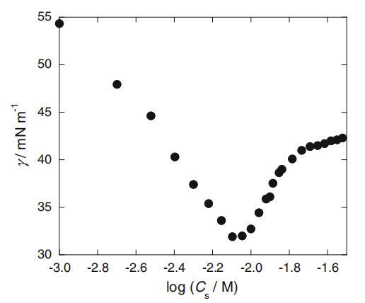 通過測量磷酸鹽和硼酸鹽緩沖液水溶液中的界面張力、熒光、動(dòng)態(tài)光散射等,研究了陰離子表面活性劑正十二烷基肌氨酸鈉(SLAS)的pH依賴性。SLAS的界面張力(γ)隨著pH值的降低而顯著降低,并在pH>7.3時(shí)保持恒定。臨界膠束濃度(cmc)和表面活性劑濃度(在其γ值比純水(C20)降低20 mN/m時(shí))的觀察值隨著pH值降低而降低,而在pH>6.5和>7.3的情況下也分別保持恒定。另一方面,當(dāng)pH<7.3時(shí),SLAS的界面過量增加。通過添加取代SLAS的Na+的Tl+進(jìn)一步研究了這些界面行為。LAS的觀測γ值?考慮到靜電相互作用和親水性頭基的分子結(jié)構(gòu),詳細(xì)討論了這些界面和膠束性質(zhì)。