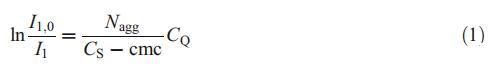 為了通過穩(wěn)態(tài)熒光猝滅法評估膠束的平均聚集數(shù)(Nagg),使用芘作為熒光探針,選擇HPYC作為靜態(tài)猝滅劑[8]。該方法基于已知濃度的猝滅劑對發(fā)光探針的猝滅。通過使用以下等式[8]分析淬火實(shí)驗(yàn):