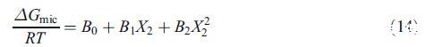 為了補充混合膠束分析的穩(wěn)定性,我們還使用了Maeda的方法,該方法還考慮了混合膠束中的疏水鏈-鏈相互作用,特別是當(dāng)鏈長度不同時[21]。簡言之,根據(jù)Maeda的模型,離子物種向非離子膠束的轉(zhuǎn)移包括兩種不同的貢獻:極性頭部基團之間的相互作用和疏水鏈之間的相互影響。當(dāng)疏水鏈相似時,第一貢獻占主導(dǎo)地位,然而,當(dāng)疏水鏈長度不同時,這些鏈之間的相互作用變得更為主導(dǎo)。Maeda的方法強調(diào),除了從規(guī)則溶液理論獲得的相互作用參數(shù)之外,還有另一個參數(shù)(B1),該參數(shù)有助于在用離子單體替換非離子純膠束中的非離子表面活性劑單體時混合膠束的穩(wěn)定性。這一過程是由于組件之間的短程相互作用而產(chǎn)生的。在該模型中,膠束化自由能(ΔGmic)作為混合膠束中離子物種摩爾分?jǐn)?shù)的函數(shù)給出如下[21,24]: