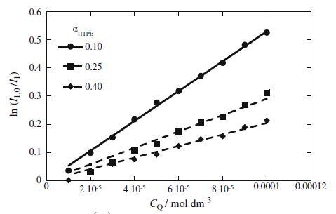 KSV值根據(jù)公式20(數(shù)據(jù)未顯示)的斜率進行評估,如圖6所示。圖6顯示KSV的值隨著HTPB成分含量的增加而降低,反映出熒光團變得更難接近猝滅劑。據(jù)報道,隨著陽離子gemini表面活性劑摩爾組成的增加,KSV降低[24]。