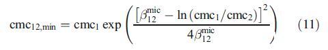 另一方面,在混合膠束形成過程中,含有兩種表面活性劑的混合物中協(xié)同作用的存在不僅取決于它們之間相互作用的強度,還取決于二元兩親混合物中單個表面活性劑組分的相關(guān)性質(zhì)[23]。因此,混合膠束形成中協(xié)同作用所需的條件是bmic 12必須為負(fù)(見上節(jié)),且βmic 12>jlnecmc1=cmc2Tj(表2)。對于本二元混合物,這兩個條件都滿足?;旌夏z束形成中可能的協(xié)同程度通過混合表面活性劑的摩爾濃度與單個組分的摩爾濃度相比的最大降低來測量,即(cmc1)?cmc12,min)/(cmc1),其中cmc12,min是混合表面活性劑的最小cmc,由下式給出:
