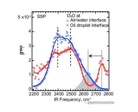 下圖顯示了分散的十二烷油滴(藍(lán)色圓圈)和空氣-水界面(紅色圓圈)的界面水(DO)光譜。(使用重水穩(wěn)定了實驗條件,并將運(yùn)行時間減少了約40%。)水分子的振動頻率偏移部分取決于與相鄰分子氫鍵的強(qiáng)度。2400 cm^-1和2500 cm^-1處的垂直虛線標(biāo)記了氫鍵影響水的氧-氘鍵的頻率邊界。兩個接口的峰值頻率范圍大致相同。