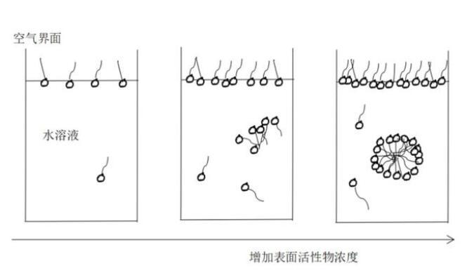 我們在文章開頭介紹過,表面活性劑是一種兩親的分子,一頭親水一頭親油。因此,低濃度時(shí)表面活性劑傾向于留在水的表面,親油(厭水)的一頭朝外,首先布滿水面,也就是水-空氣界面,所以會降低這個(gè)界面的張力。