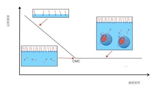 但是當(dāng)濃度超過一個(gè)點(diǎn)時(shí),表面活性劑會開始抱團(tuán),形成膠束,界面張力不再下降,這個(gè)濃度叫做臨界膠束濃度。