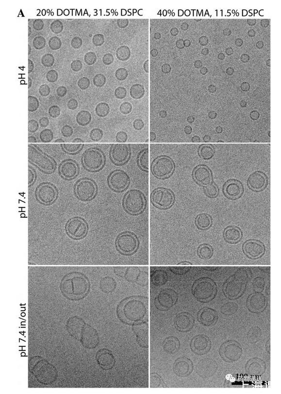 此外還發(fā)現(xiàn),采用乙醇稀釋/快速混合技術(shù)制備LNP-siRNA,當(dāng)siRNA含量較高時,表現(xiàn)為堆疊的小雙層結(jié)構(gòu),其中siRNA被包載于緊密相連的脂質(zhì)雙分子層之間;當(dāng)siRNA含量較低時,堆疊結(jié)構(gòu)的比例降低,LNP-siRNA復(fù)合物系統(tǒng)則表現(xiàn)出siRNA雙層結(jié)構(gòu)和非晶態(tài)電子致密核的組合,這可能是由中性形式的可電離陽離子脂質(zhì)產(chǎn)生的油滴而形成。所得結(jié)論為:含可電離陽離子脂質(zhì)的LNP體系在pH=4時形成雙層結(jié)構(gòu),在pH=7.4時形成非晶態(tài)“固體核”結(jié)構(gòu)。