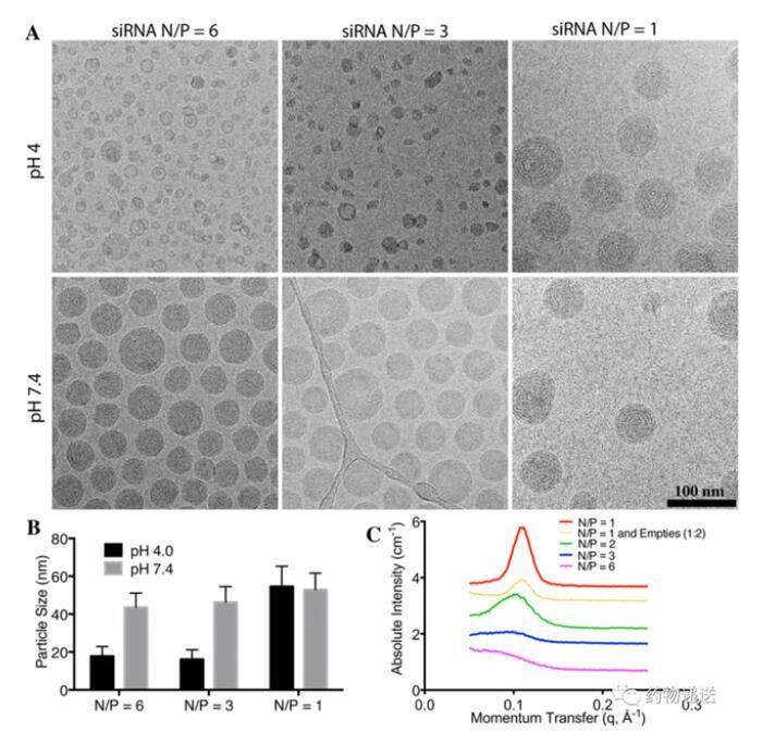 使用帶電荷脂質(zhì)制備siRNA-LNP時,正電荷與負電荷的數(shù)量比會影響納米粒的大小、穩(wěn)定性、電位等性能。在siRNA-LNP中,正電荷通常為具有可電離銨根(N)的陽離子脂質(zhì),而負電荷則為帶有大量磷酸根(P)的核酸分子,兩者可通過靜電吸附的方式結(jié)合在一起。因此,不合理的比例可能會導(dǎo)致粒徑過大、穩(wěn)定性差等缺陷。值得一提的是,在研究中發(fā)現(xiàn),當(dāng)N/P=1時,pH中和后LNP的粒徑不會有較大改變;當(dāng)N/P=3或者6時,LNP在pH=7.4的緩沖液中粒徑會變大。而永久陽離子脂質(zhì)(例如DOTAP)制備的LNP在任何pH緩沖液中都不具有固體核心結(jié)構(gòu)。