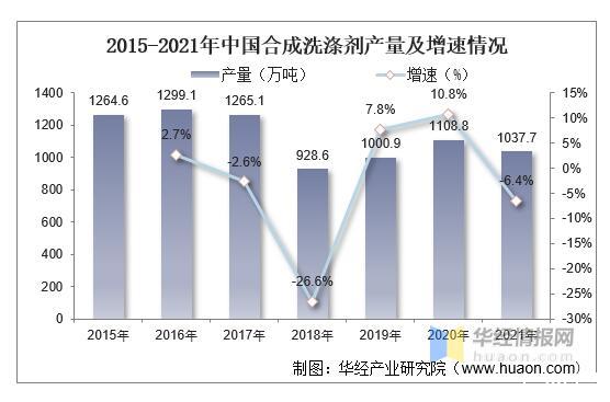 2015-2021年中國(guó)合成洗滌劑產(chǎn)量及增速情況
