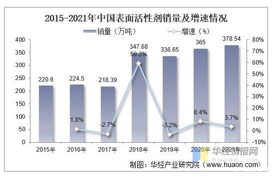 2015-2021年中國(guó)表面活性劑銷量及增速情況