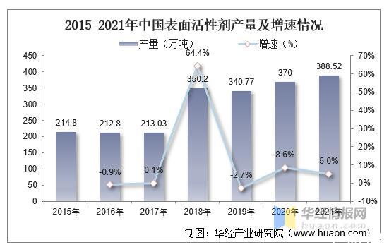 2015-2021年中國(guó)表面活性劑產(chǎn)量及增速情況