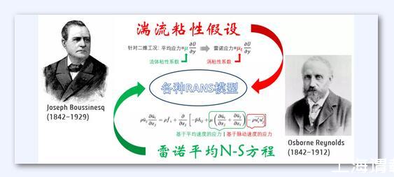 湍流粘性來源于雷諾平均的N-S方程,下式中多出來的脈動應(yīng)力項,稱之為雷諾應(yīng)力。1877年Boussinesq借助于牛頓切應(yīng)力公式,提出了影響深遠的渦粘性假設(shè):雷諾應(yīng)力正比于時均速度梯度,其中比例系數(shù)μt表征了湍流脈動引起的切應(yīng)力效應(yīng),稱為渦粘性系數(shù)。