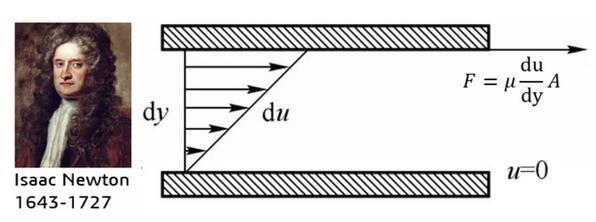 正如前面所說,人們很早便感受到了流體具有“粘”的屬性,但是如何從科學上表達流體的粘性成為了一個新的問題。作為世界物理學界金字塔尖的男人,牛頓幾乎霸屏了整個中學物理課本,當然也沒有放過流體。1686年,牛頓經(jīng)過大量的實驗研究,提出了著名的“內(nèi)摩擦定律”——流體的內(nèi)摩擦力(即粘性力)的大小與流體的性質(zhì)(粘性系數(shù)μ)有關(guān),并與流體的速度梯度和接觸面積成正比。
