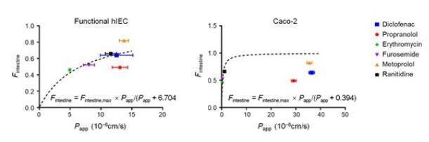 隨后,研究分析了各種腸道轉(zhuǎn)運(yùn)體和代謝酶的表達(dá)水平,通過RNA測(cè)序與酶活性檢測(cè),發(fā)現(xiàn)腸道堿性磷酸酶(IAP)和CYP3A4在功能性hIEC中表達(dá)量相當(dāng)高,這些結(jié)果表明功能性hIEC具有藥物轉(zhuǎn)運(yùn)體和藥物代謝酶活性,是評(píng)價(jià)藥物體外生物利用度所必需的。本研究使用了6種臨床藥物:美托洛爾、普萘洛爾、雙氯芬酸、雷尼替丁、呋塞米和紅霉素,進(jìn)行體外藥物吸收試驗(yàn),發(fā)現(xiàn)與Caco-2模型不理想的體內(nèi)外相關(guān)性相比,功能性hIEC與已公布的人體內(nèi)腸道吸收數(shù)據(jù)擬合的相關(guān)性良好,說明功能性hIEC可以更好地預(yù)測(cè)人的口服生物利用度和吸收程度。