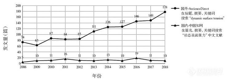 當研究的液體吸附過程在快速、持續(xù)進行,且短時間內無法達到平衡時,對液體DST的研究比靜態(tài)表面張力更有意義。如在農藥噴灑、噴墨印刷、織物快速潤濕,以及攝影用薄膠片制備中。圖1對比了近10年(2008~2018年)國內外發(fā)表的以DST為主要考察項的論文數(shù)。數(shù)據(jù)顯示國內在DST方面的研究較少且總體波動不大,而國外則呈持續(xù)上升趨勢。