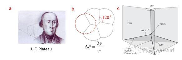 泡沫物理學(xué)集中于研究泡沫的結(jié)構(gòu)、靜力學(xué)、動態(tài)演變及排液等內(nèi)容。它是一個十分古老的學(xué)科,由比利時物理學(xué)家Plateau在19世紀中葉開創(chuàng)(圖2a)。Plateau在數(shù)十年的失明的時光里,依舊通過指導(dǎo)他侄子做試驗,堅持研究肥皂泡薄膜的幾何形態(tài)及其背后隱藏的力學(xué)規(guī)律。1873年,他和侄子把自己的實驗現(xiàn)象和分析結(jié)果做了系統(tǒng)整理,以法文發(fā)表,從此把對泡沫結(jié)構(gòu)的研究由定性印象推到了量化階段,開創(chuàng)了泡沫物理學(xué)(Ref 2)。在泡沫靜力學(xué)方面,Plateau的主要貢獻在于其提出了干泡沫的靜態(tài)結(jié)構(gòu)力學(xué)的三定律,它是后續(xù)泡沫研究的基石:
