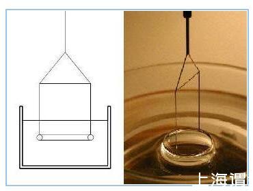 掛環(huán)法(Du Nouy Ring method):這可能是測(cè)量表面/界面張力的最經(jīng)典方法,文獻(xiàn)上報(bào)道的許多液體的表/界面張力值是用這一方法測(cè)得,它甚至可以在很難浸濕的情況下被使用。用一個(gè)初始浸在液體的環(huán)從液體中拉出一個(gè)液體膜(類似肥皂泡),同時(shí)測(cè)量提高環(huán)的高度時(shí)所需要施加的力。